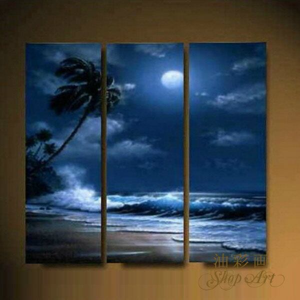 3パネル 『満月の海辺とやしの木』 油彩画 インテリア モダン アートパネル W0230