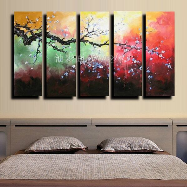 5パネル 太い枝に咲く花 油彩画 インテリア モダン アートパネル W0406 Lサイズ