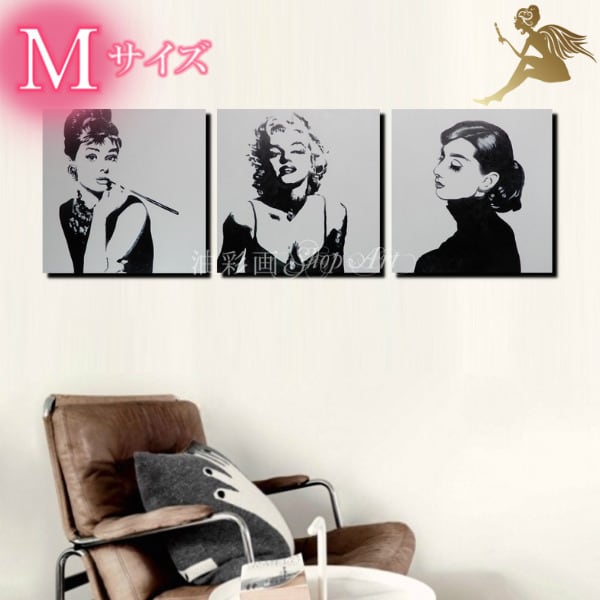 3パネル 『マリリンモンロー&オードリーヘップバーン モノトーン Mサイズ』 油彩画 インテリア モダン アートパネル 1634
