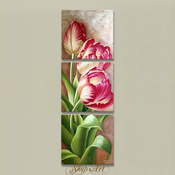 3パネル 縦 ピンクチューリップ 油彩画 インテリア モダン アートパネル 1523