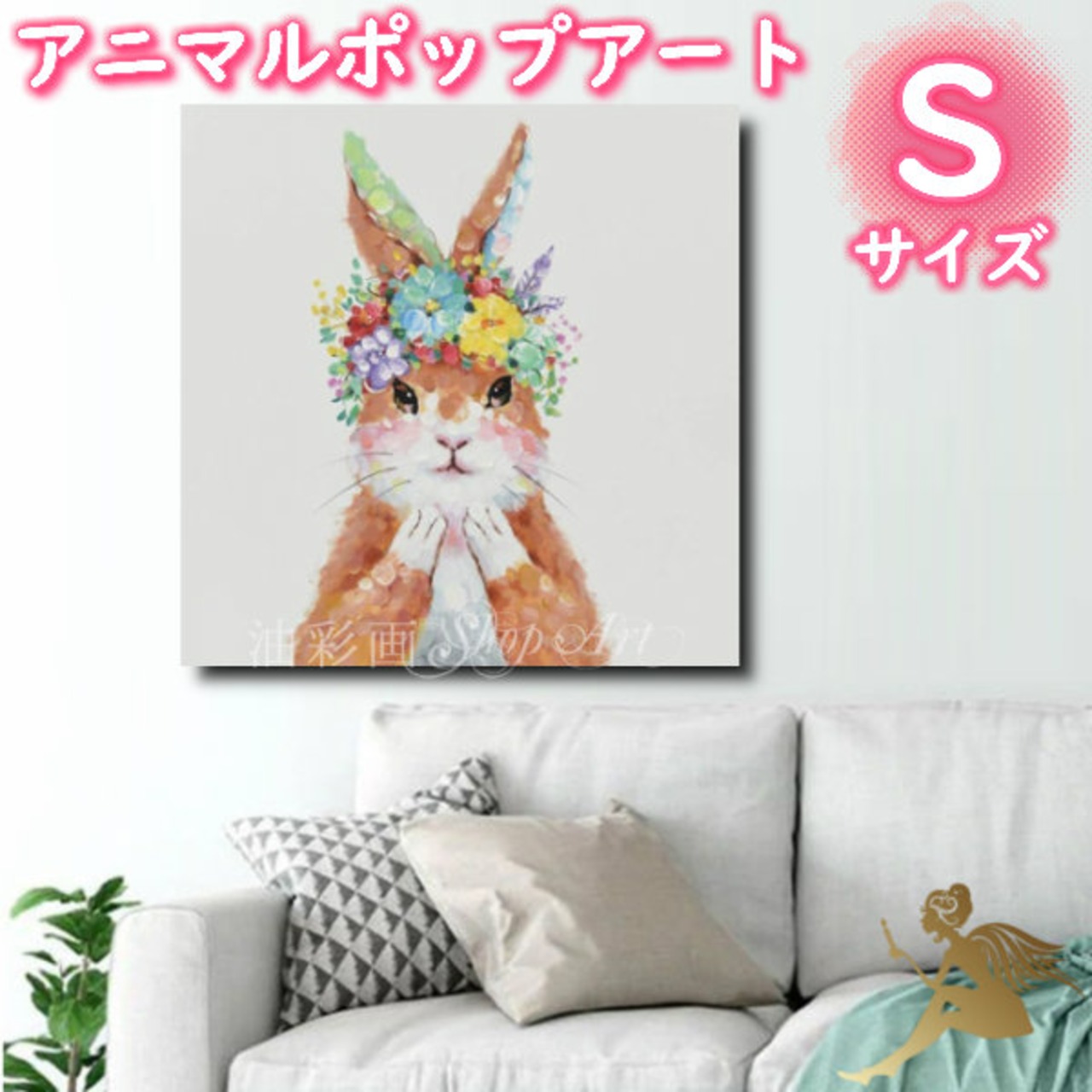 1パネル アニマルポップアート お花とラビット Sサイズ 油彩画 インテリア モダン アートパネル 5080s