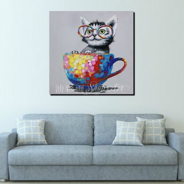 1パネル アニマルポップアート カップinキャット Sサイズ 油彩画 インテリア モダン アートパネル 5096s