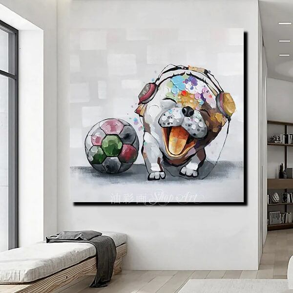 1パネル アニマルポップアート サッカーボールとノリノリワンチャン Mサイズ 油彩画 インテリア モダン アートパネル 5189m