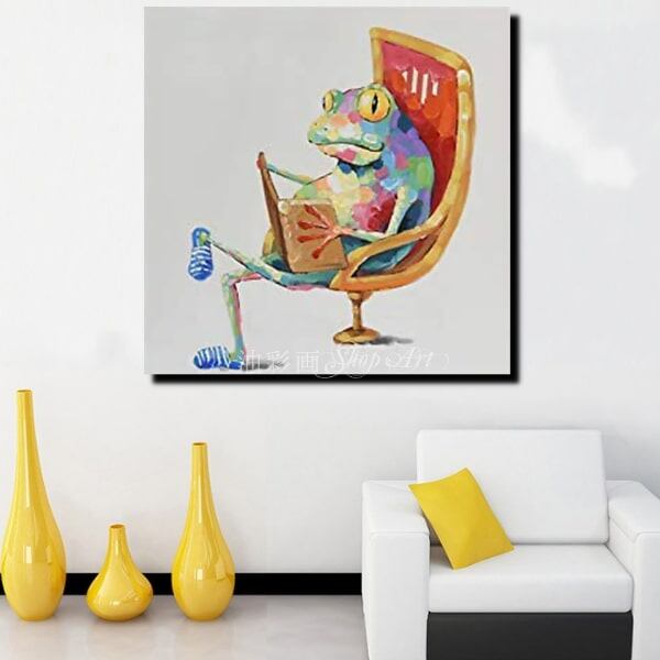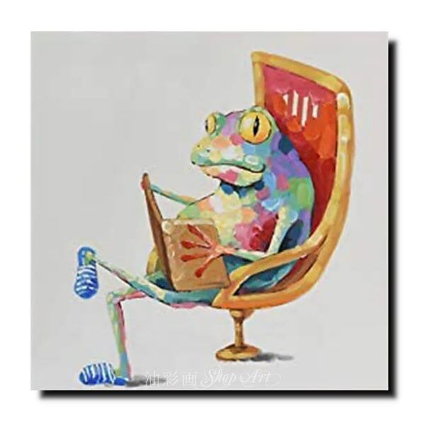 1パネル アニマルポップアート 読書中のカエルさん Lサイズ 油彩画 インテリア モダン アートパネル 5211l