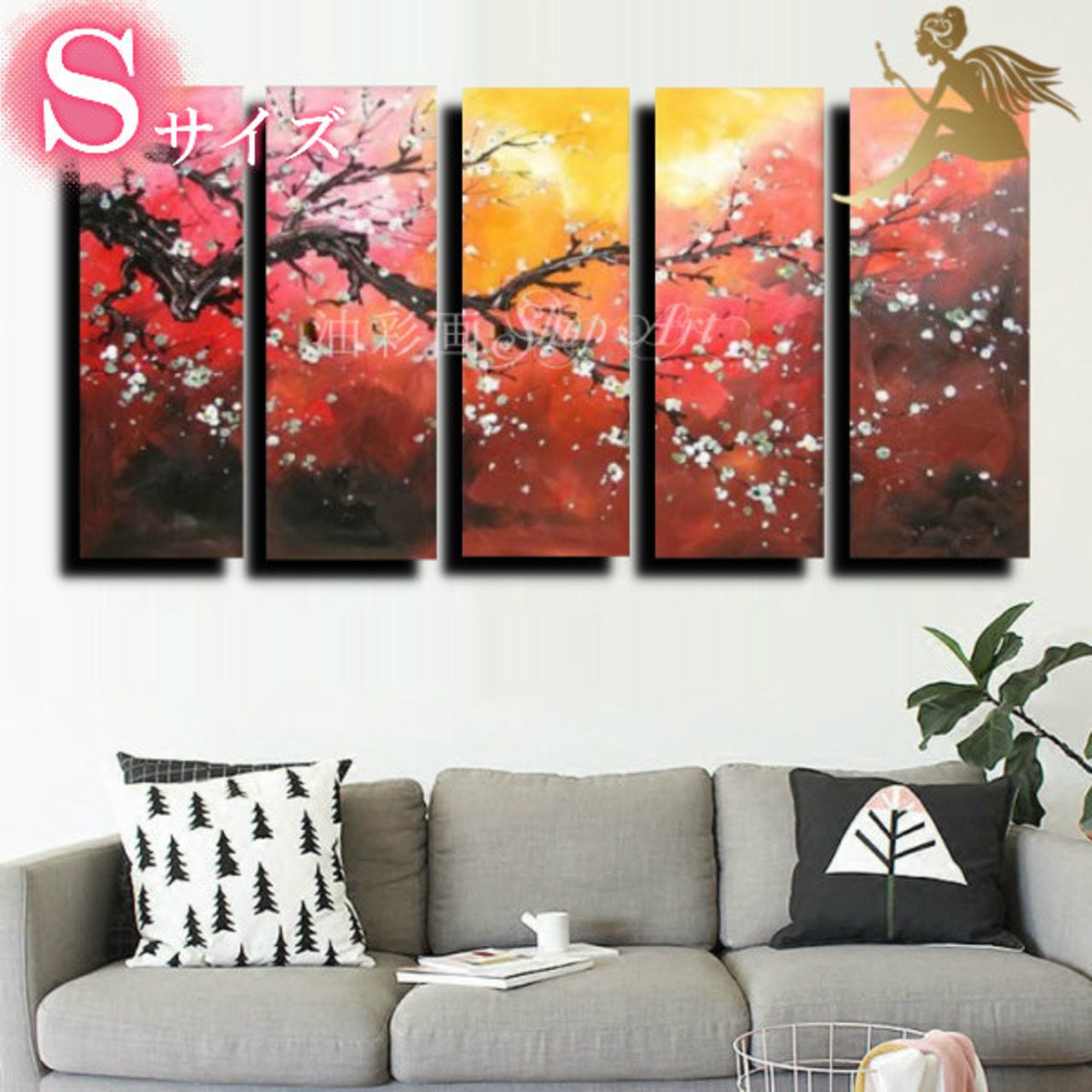 5パネル 『太い枝に咲く白い花 Sサイズ』 油彩画 インテリア モダン アートパネル w0399s